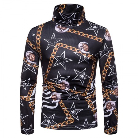 New Men's Large Size 3D Star Chain Print High Neck Long Sleeve T-Shirt Bottoming Shirt